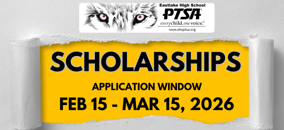 Eastlake Seniors - apply for the PTSA Scholarships! Our PTSA offers three scholarships – Katherine Siddoway Scholarship, Community Service Award Scholarship, and Perseverance Scholarship – In honor of Lori Rowe. Six $1,000 scholarships will be awarded to different graduating seniors from Eastlake High School who will start college (either two-year or four-year) in the fall of 2026. To learn more or apply, visit the EHS PTSA Scholarships Program Page.